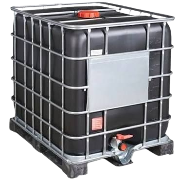 Cuve IBC de 1000 L noire anti-UV sur palette plastique, conçue pour le stockage et le transport de liquides.